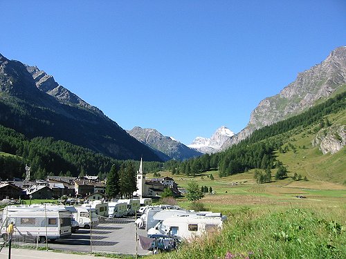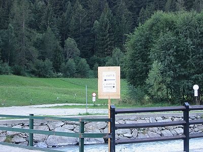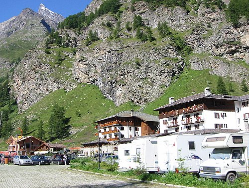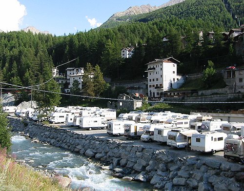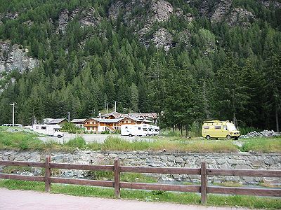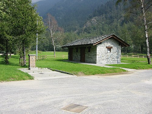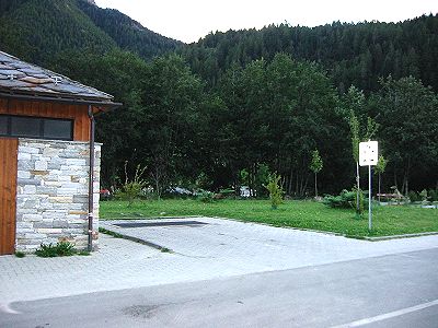 Champoluc, a sinistra, sul lago (1338 mt slm): per primo si incontra il CS, poi si incontra uno spazio adatto alla sosta estiva, oltre il